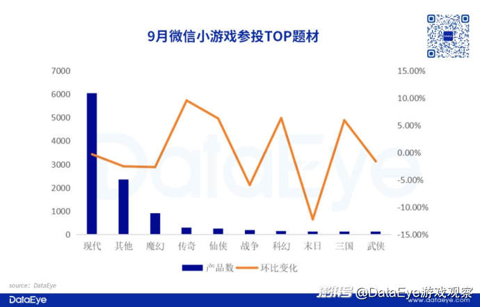 參投微信小游戲題材TOP10分類中,現(xiàn)代、其他、魔幻排名前三。9月傳奇題材產(chǎn)投游戲數(shù)最多,環(huán)比提升接近10%。而科幻題材增長(zhǎng)也超過(guò)5%。戰(zhàn)爭(zhēng)和末日在是9月熱投題材TOP10中降幅最多的題材。