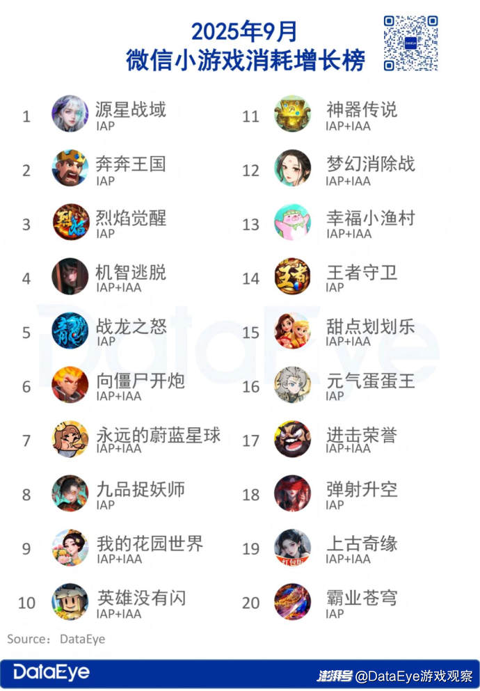 9 月 消耗增長(zhǎng)榜數(shù)據(jù)顯示,《源星戰(zhàn)域》排名第一,《奔奔王國(guó)》排名第二,第三名則是《烈焰覺醒》。除此之外,《英雄沒有閃》和《機(jī)智逃脫》都在月度消耗增長(zhǎng)榜TOP10席位之中。