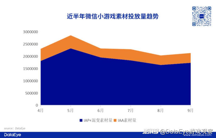 素材量 方面,DataEye-ADX投放數(shù)據(jù)顯示,9月微信小游戲投放素材量 (圖片+視頻)約為213萬(wàn),環(huán)比8月上漲4.8%。9月是7、8月暑期檔回歸常態(tài)的一個(gè)月,這就意味著一些采用“錯(cuò)峰投放、避其鋒芒”策略的產(chǎn)品和品類會(huì)回歸買量營(yíng)銷常態(tài)。