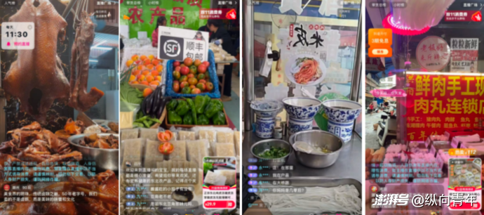 包括不限于擺滿熟食、只有夫妻倆忙碌經(jīng)營的小店;有經(jīng)營資質(zhì)的涼拌米皮小吃也全國包郵油辣子;東北四平菜市場內(nèi)順豐包郵豬皮凍的攤主,連帶幫旁邊的攤位賣點柿子黃瓜,以及揭陽當(dāng)?shù)氐牟藞龅某鄙鞘执蚺H馔?,就在直播間內(nèi)現(xiàn)做現(xiàn)塑封。