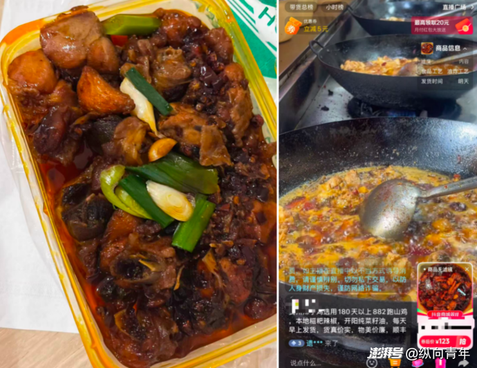 整場直播沒有任何技巧,鏡頭直擊小店灶臺,主廚即是主播,沒有叫賣沒有互動,只在往油鍋里下肉下辣椒的間隙看眼屏幕,手里翻炒動作不斷,偶爾看著屏幕,帶著點貴普口音,說一句“快遞可發(fā)全國”。
