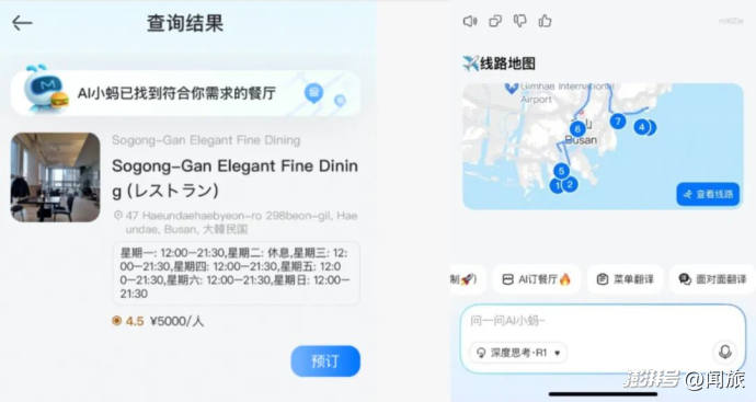 而馬蜂窩其他AI工具,則充當(dāng)了她的半個(gè)當(dāng)?shù)叵驅(qū)Ш头g,特別是查詢餐廳可以直接預(yù)訂,有沒(méi)有位子要不要排隊(duì)這些當(dāng)場(chǎng)就可以知道,這對(duì)于她這個(gè)負(fù)責(zé)行程計(jì)劃的人來(lái)說(shuō),是解決了大問(wèn)題,原本擔(dān)心的語(yǔ)言溝通問(wèn)題,也基本不存在了。