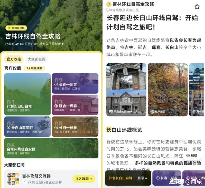 就拿北極星攻略曾發(fā)布過(guò)并且很受歡迎的一套吉林自駕環(huán)線攻略為例,不僅從線路上給用戶提供了覆蓋長(zhǎng)春至長(zhǎng)白山環(huán)線自駕線路規(guī)劃、環(huán)線美食&住宿推薦及長(zhǎng)白山西南北坡特色玩法等不同選擇,還很大程度上豐富了長(zhǎng)白山自駕旅行內(nèi)容信息。