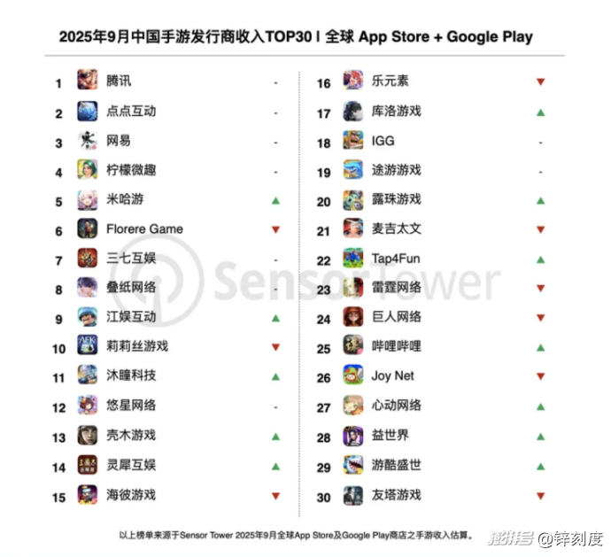 Sensor Tower的數(shù)據(jù)顯示,2025年9月中國手游發(fā)行商全球收入總榜,騰訊、點(diǎn)點(diǎn)互動、網(wǎng)易位居排行榜前三,呈現(xiàn)三足鼎立之勢。