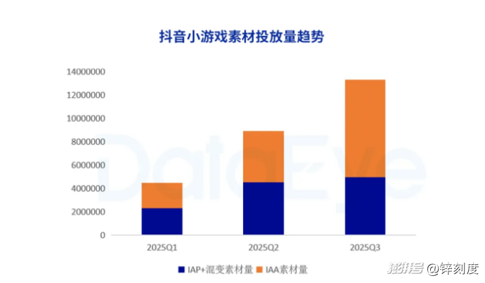 《2025年Q3小游戲買量數(shù)據(jù)報(bào)告》顯示,抖音小游戲2025年第三季度的素材投放量超過1300萬,較第二季度增長接近50%,在暑期檔呈現(xiàn)膨脹態(tài)勢。