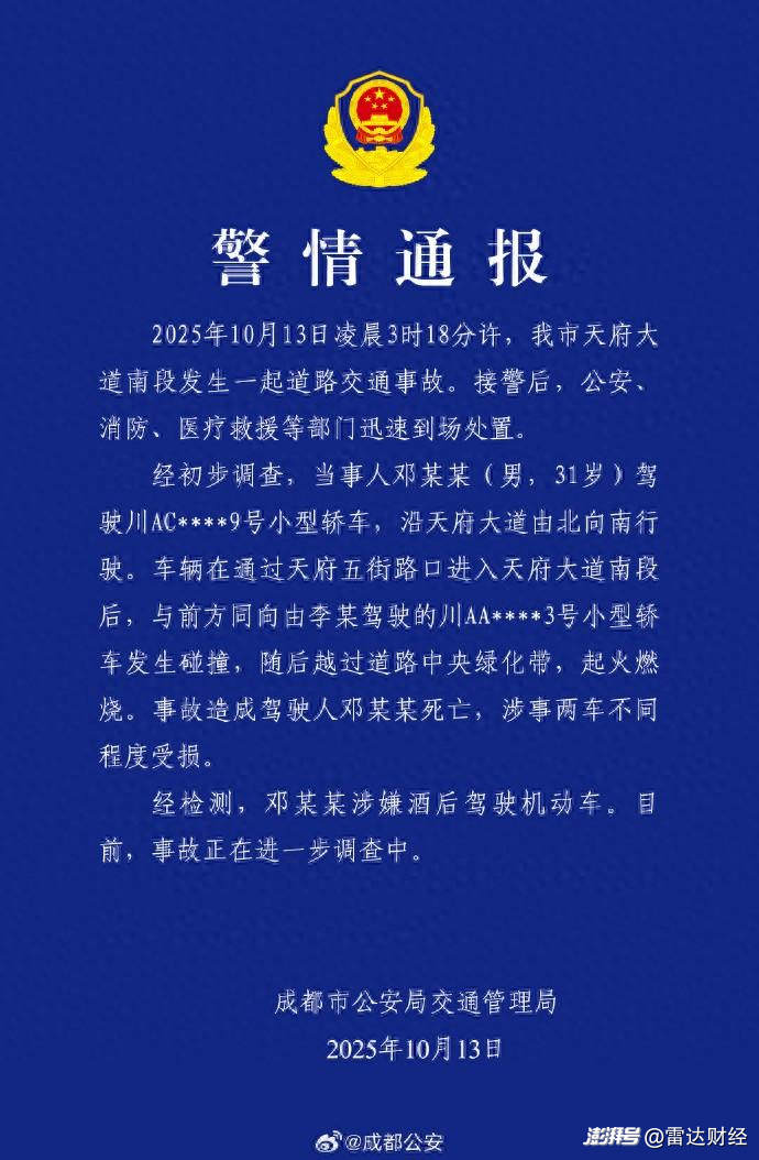 當(dāng)日下午,成都公安微博發(fā)布警情通報(bào)稱,事故造成司機(jī)鄧某某死亡,經(jīng)檢測(cè)涉嫌酒后駕駛機(jī)動(dòng)車,目前事故正在進(jìn)一步調(diào)查中。