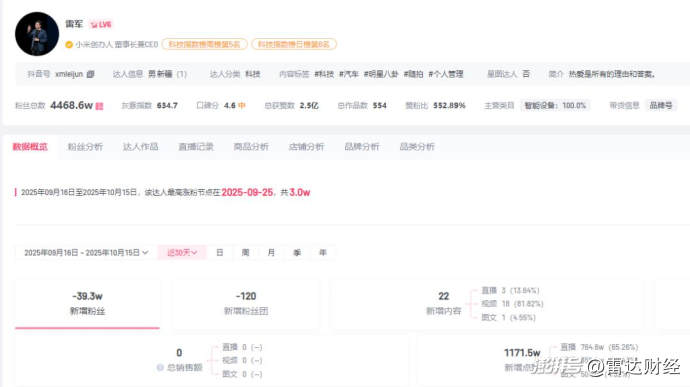 此外,灰豚數(shù)據(jù)顯示,在9月16日至10月15日的30天內(nèi),小米創(chuàng)始人雷軍的個(gè)人賬號(hào)粉絲凈增為負(fù)數(shù),掉粉39.3萬(wàn)。