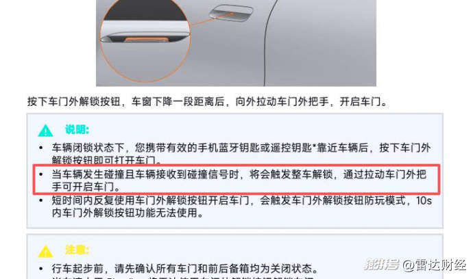 在小米SU7的說(shuō)明書中,明確表示:“當(dāng)車輛發(fā)生碰撞且車輛接受到碰撞信號(hào)后時(shí),將會(huì)觸發(fā)整車解鎖,通過(guò)拉動(dòng)車門把手可開(kāi)啟車門。”然而,在成都事故的現(xiàn)場(chǎng)視頻中,救援的路人卻始終無(wú)法打開(kāi)車門。