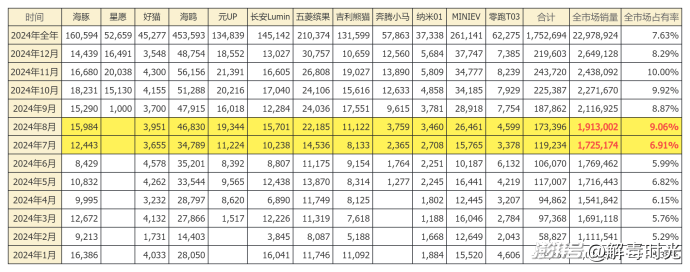 如今的新能源市場上,有一些價格在10萬元以下的純電產(chǎn)品,由于價格不高,很容易受到市場上價格波動的影響,可以說是市場價格變動的晴雨表。對此,在選擇12款產(chǎn)品作為參考,并對它們在2024年的銷量進(jìn)行研究時發(fā)現(xiàn),這12款車的合計銷量,在8月有了一個明顯的上升,在全市場的占有率一躍提升了兩個點,而此后也能相對穩(wěn)定在9%上下。