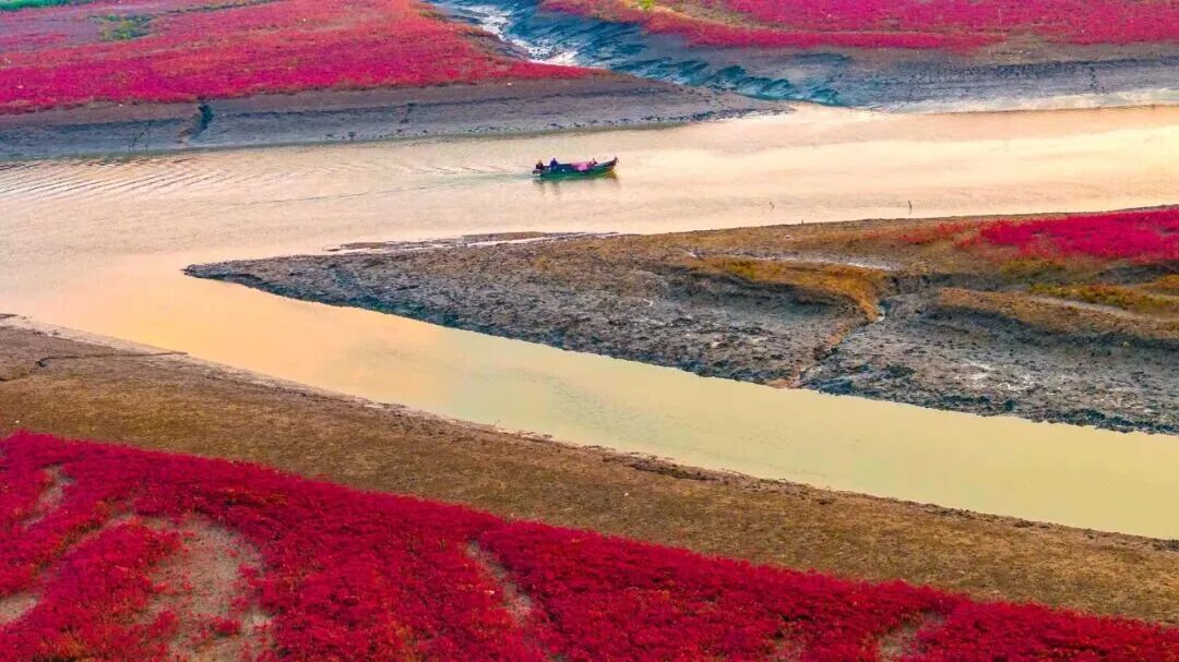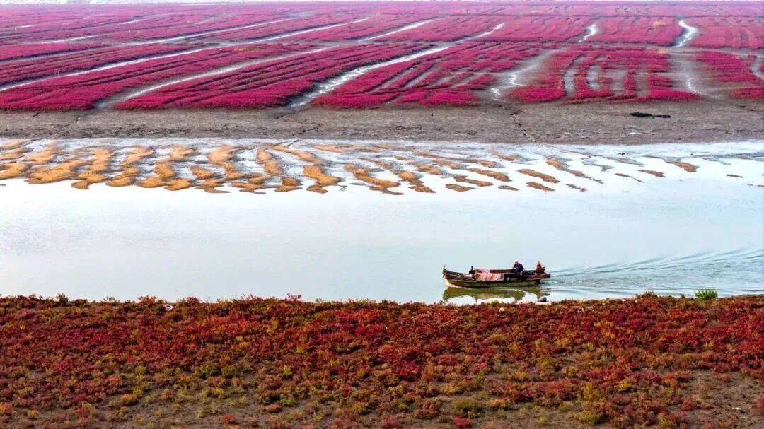退潮后的灘涂之上,鹽地堿蓬織就的“紅海毯”綿延,與蜿蜒的潮溝、入海的河水交相輝映,白鷺翔舞其間,老船靜泊如詩(shī),這片秋日限定的生態(tài)奇觀正迎來一年中最動(dòng)人的時(shí)刻,等待著八方游人共赴這場(chǎng)自然之約。