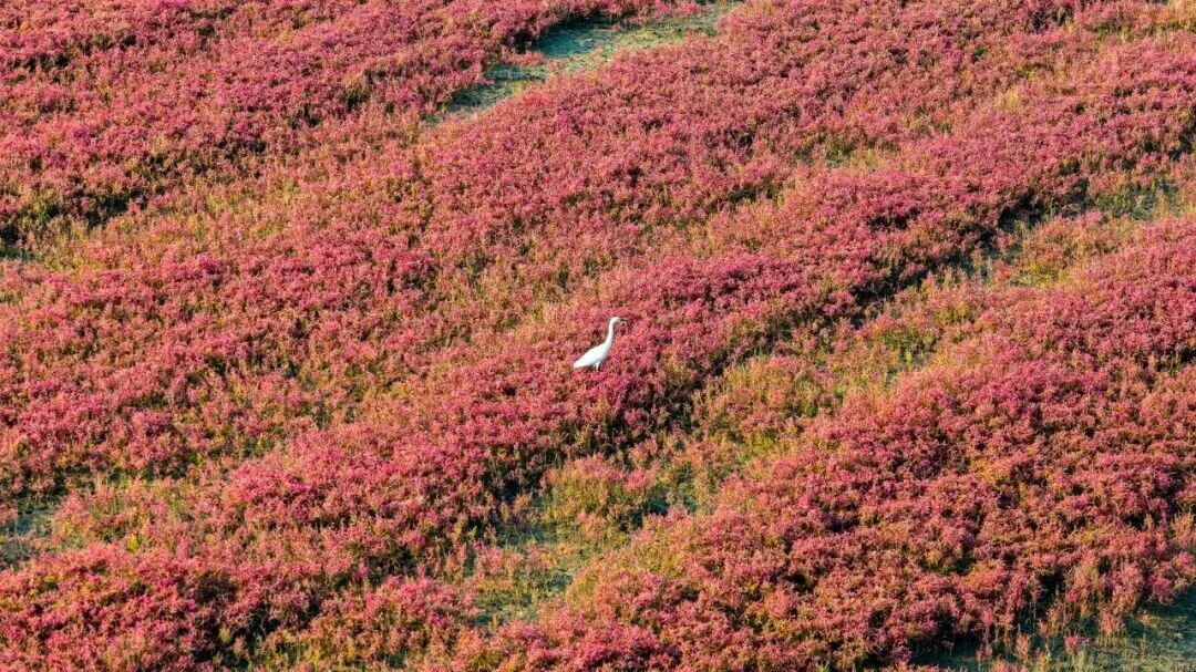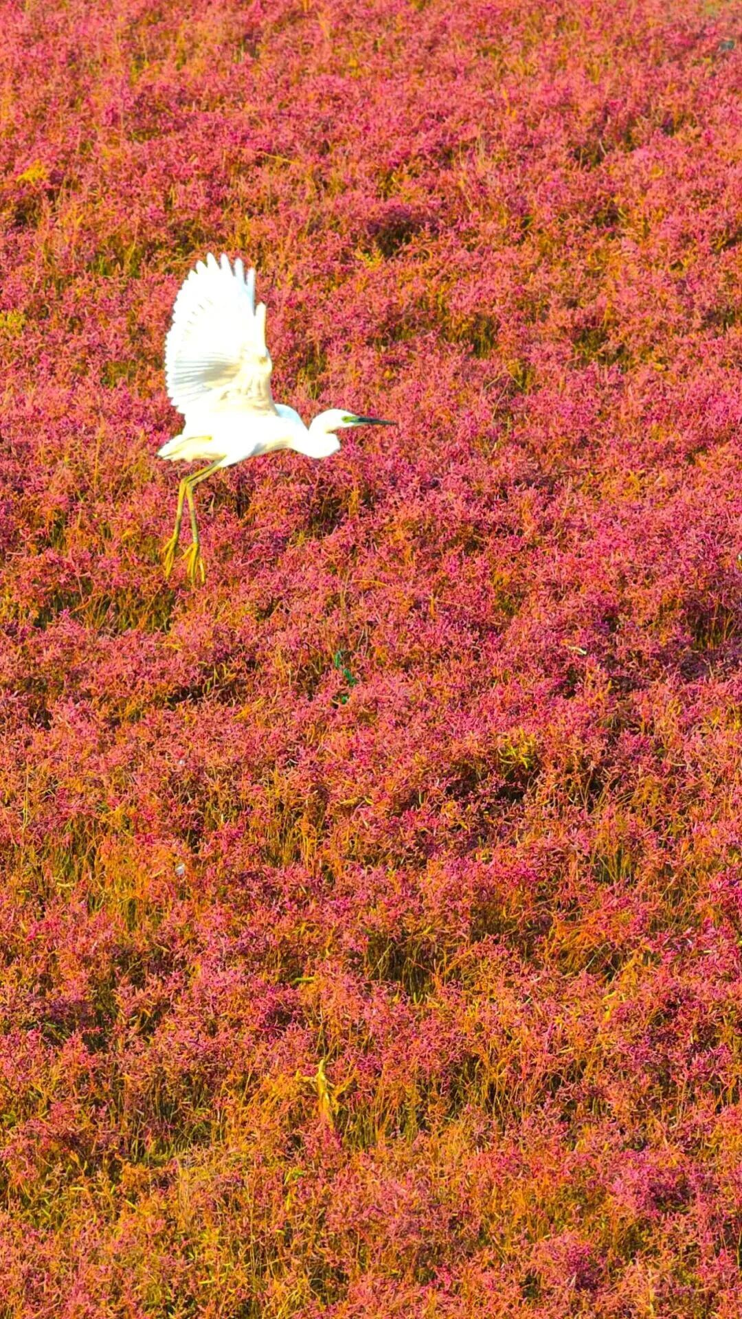 紅海灘的靈動(dòng),藏在那些與紅色共生的生命里。剛走上步道,便見一群白鷺展開雙翼掠過灘涂,它們時(shí)而輕盈降落,用細(xì)長(zhǎng)的喙在泥中啄食小魚和貝類,時(shí)而騰空而起,潔白的身影在紅灘背景下劃出優(yōu)美弧線。