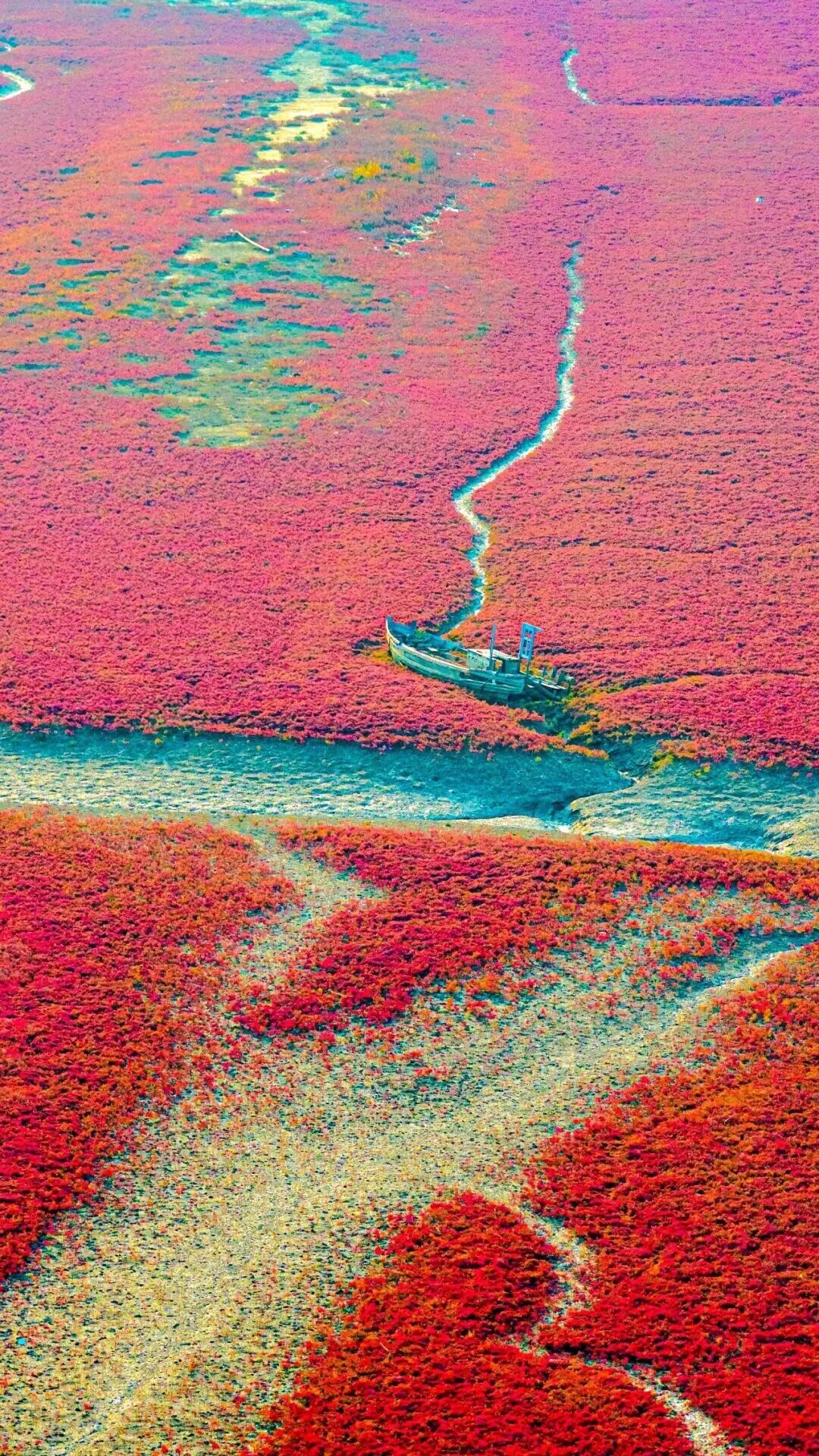 紅海灘的詩(shī)意,還少不了老船的點(diǎn)綴。在灘涂深處,兩艘斑駁的木船靜泊在堿蓬草環(huán)繞的水灣中,船身的裂痕記錄著歲月的滄桑,卻與周邊的生機(jī)形成奇妙共鳴。