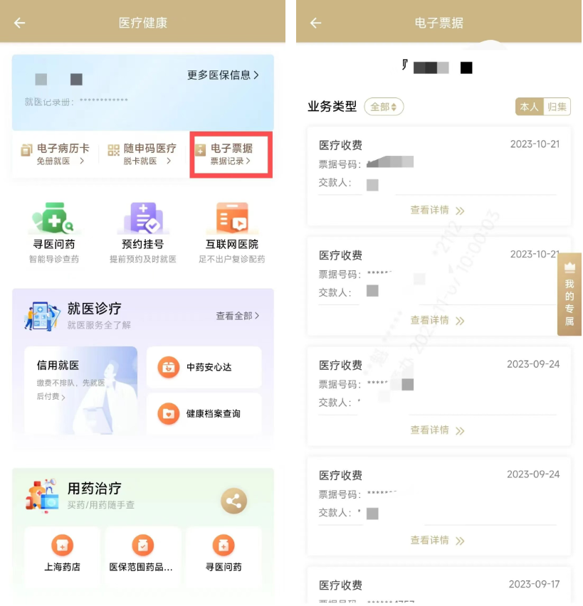 電子票據(jù):點(diǎn)擊進(jìn)入【電子票據(jù)】服務(wù),即可查看往期醫(yī)療付費(fèi)記錄。