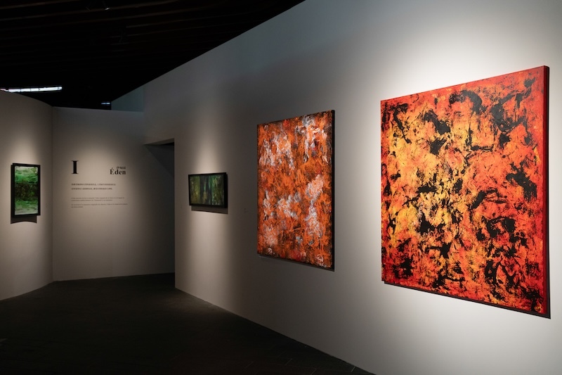 走進(jìn)上海復(fù)星藝術(shù)中心一樓展廳,一幅幅色彩厚重、肌理層次豐富的抽象繪畫(huà),或像一片森林的暗影、 一道裂隙、又或是一抹天空的余暉,一片蘆葦……抽象的視覺(jué)語(yǔ)言,隱喻著文明、自然與人性。這便是洛朗·法比尤斯的全球首次個(gè)展“在樂(lè)園”。