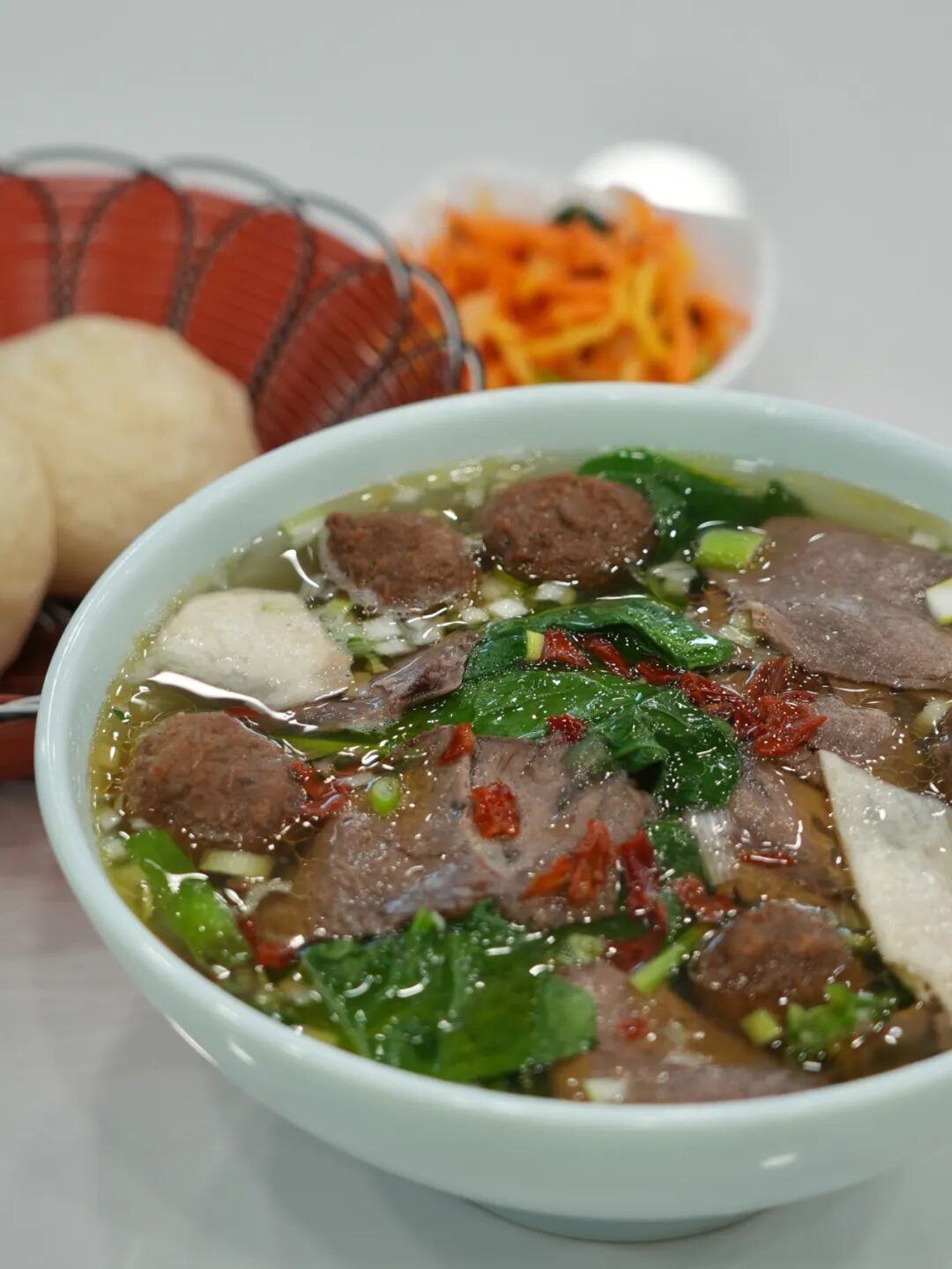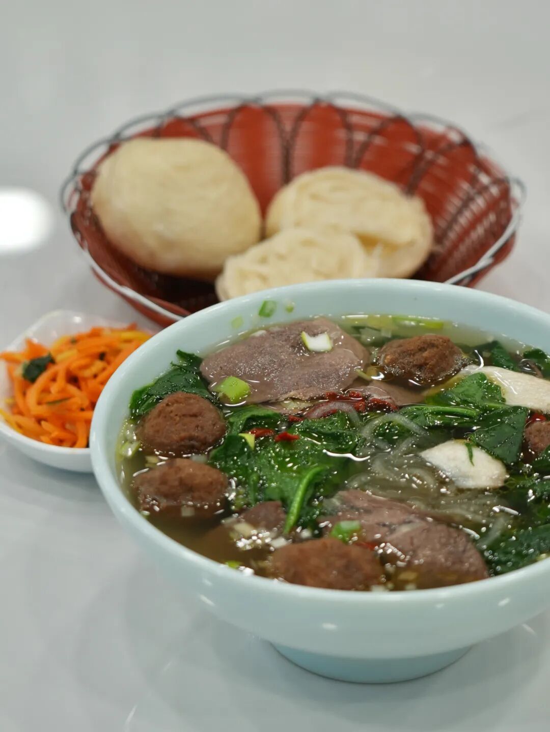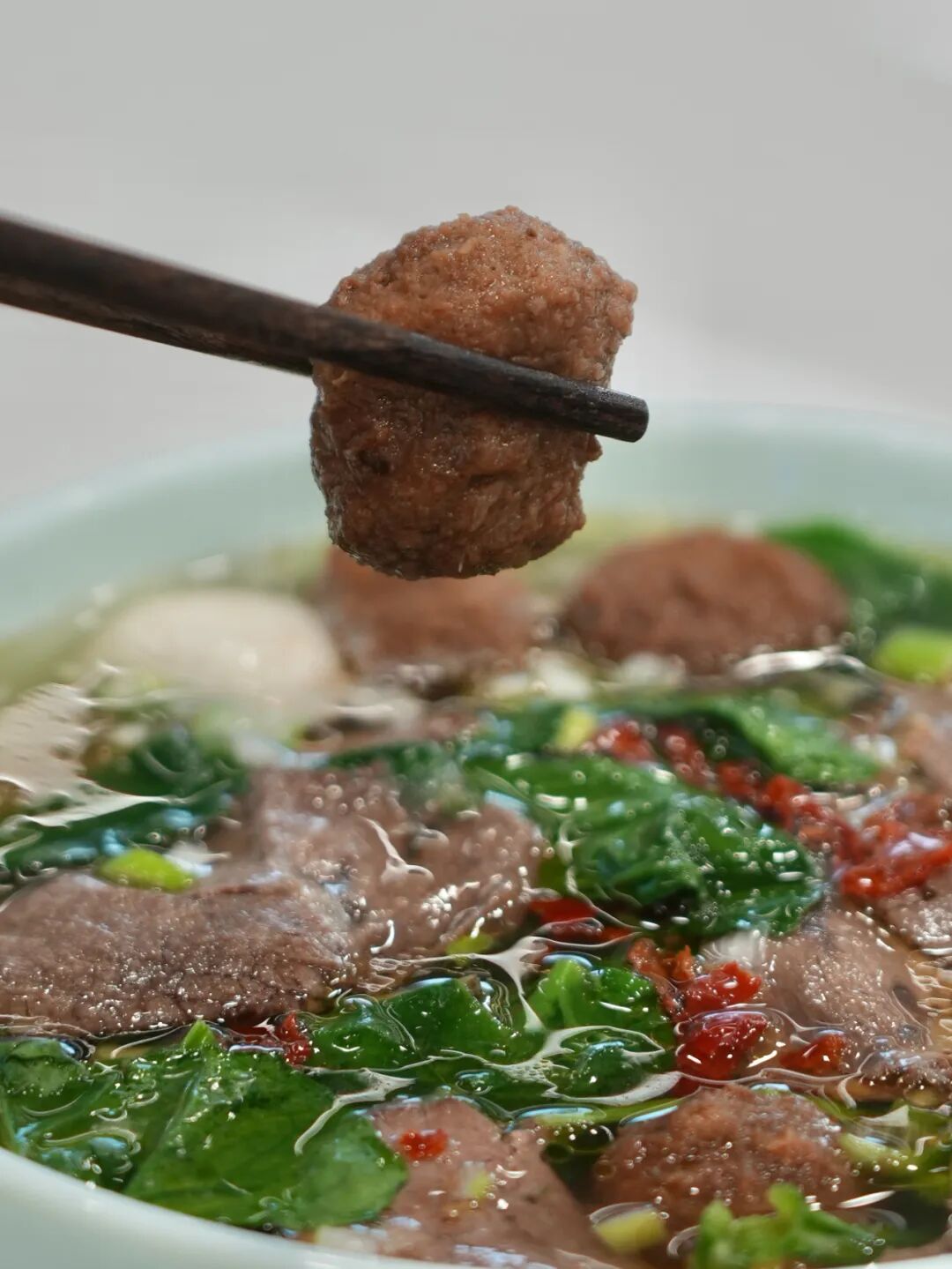店里每天用新鮮牛棒骨長(zhǎng)時(shí)間熬制湯底。除此之外,丸子自然是主角。新鮮牛肉細(xì)細(xì)剁成肉泥,加入調(diào)料后再捏成丸子入油鍋炸至金黃,一碗丸子湯工序頗多。
