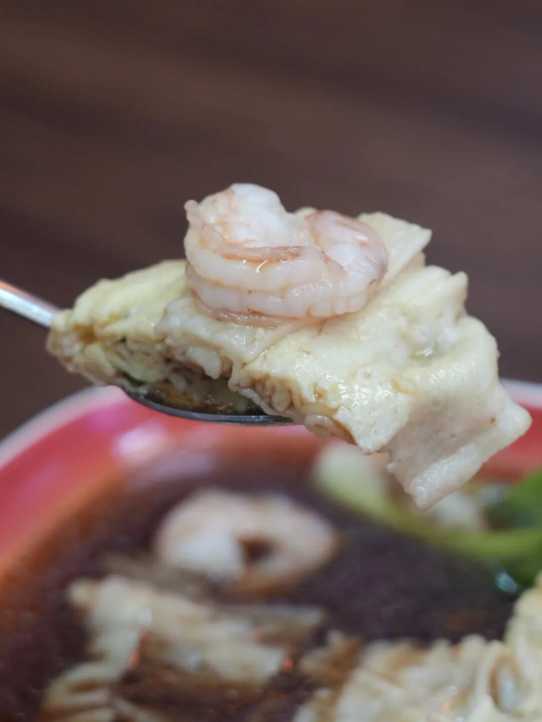 腸粉是另一項(xiàng)“必吃”美味。米漿每天用米現(xiàn)磨,蒸出來(lái)的粉皮透亮如紗,摞著蝦仁,淋一勺豉油汁,入口軟滑又鮮甜。