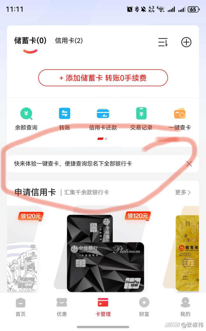 注冊(cè)“云閃付”以后,點(diǎn)擊“卡管理”,就會(huì)出現(xiàn)“一鍵查卡”的入口。