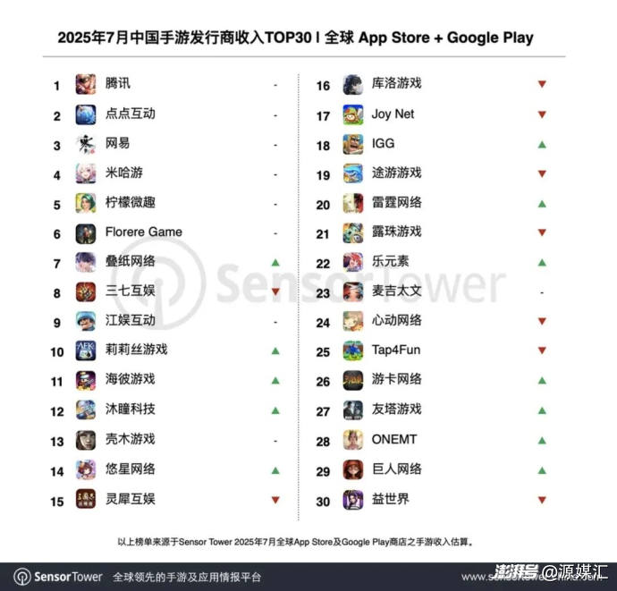 Sensor Tower發(fā)布的數據顯示,2025年7月,共有32家中國廠商入圍全球手游發(fā)行商收入榜TOP100,合計收入達到19.5億美元,占本期全球TOP100手游發(fā)行商收入34%。榜單中,騰訊、點點互動、網易位列前三,米哈游勉強排在第四的位置。