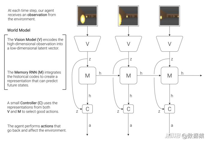 智能體包含緊密相連的三個(gè)模塊:視覺 (V)、記憶 (M) 和控制器 (C)(來自World Models)