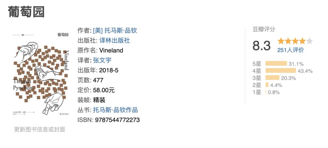 《葡萄園》出版于1990年,是托馬斯·品欽的第四部作品,故事發(fā)生在1960年代和1980年代的加州,描寫了一名FBI密探和一名激進的女制片人間的故事。