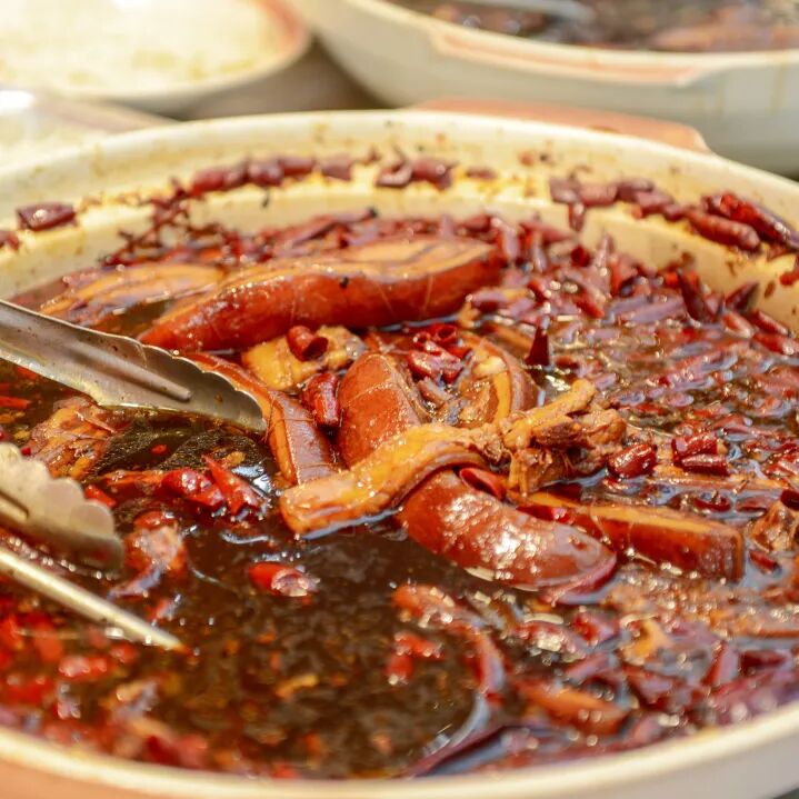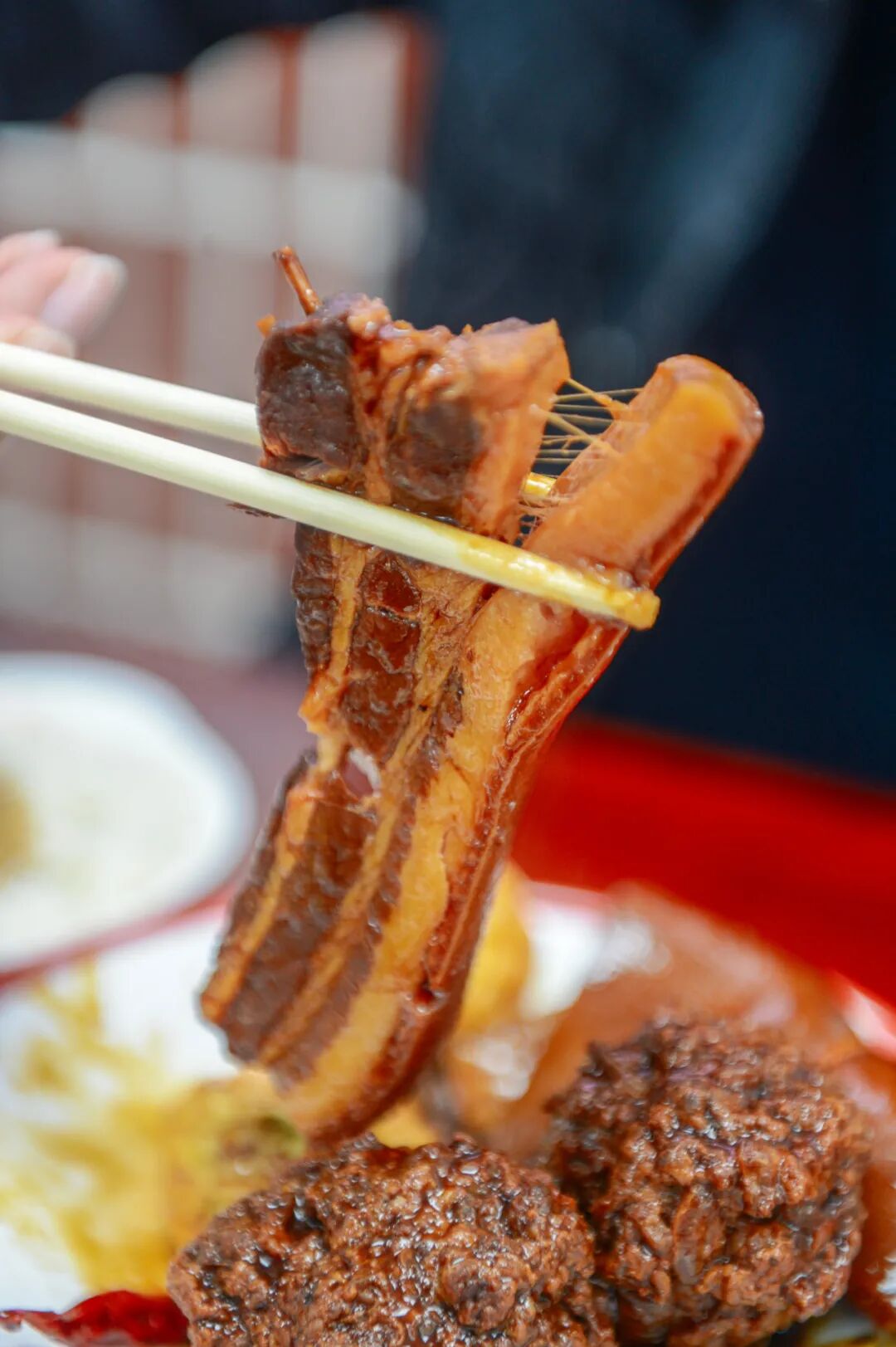 剛出鍋的把子肉泛著油亮醬色,肥瘦相間的紋理裹滿濃香,咬一口,肉質(zhì)軟糯卻絲毫不膩,醬香順著舌尖直竄腦門。