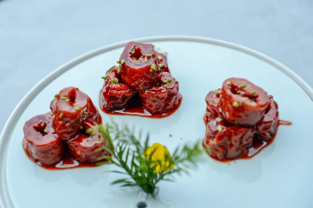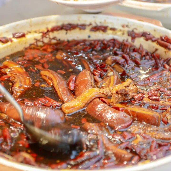 九轉(zhuǎn)大腸層層疊疊,肥腴里透著微甜回甘,脂香直往鼻尖鉆;
