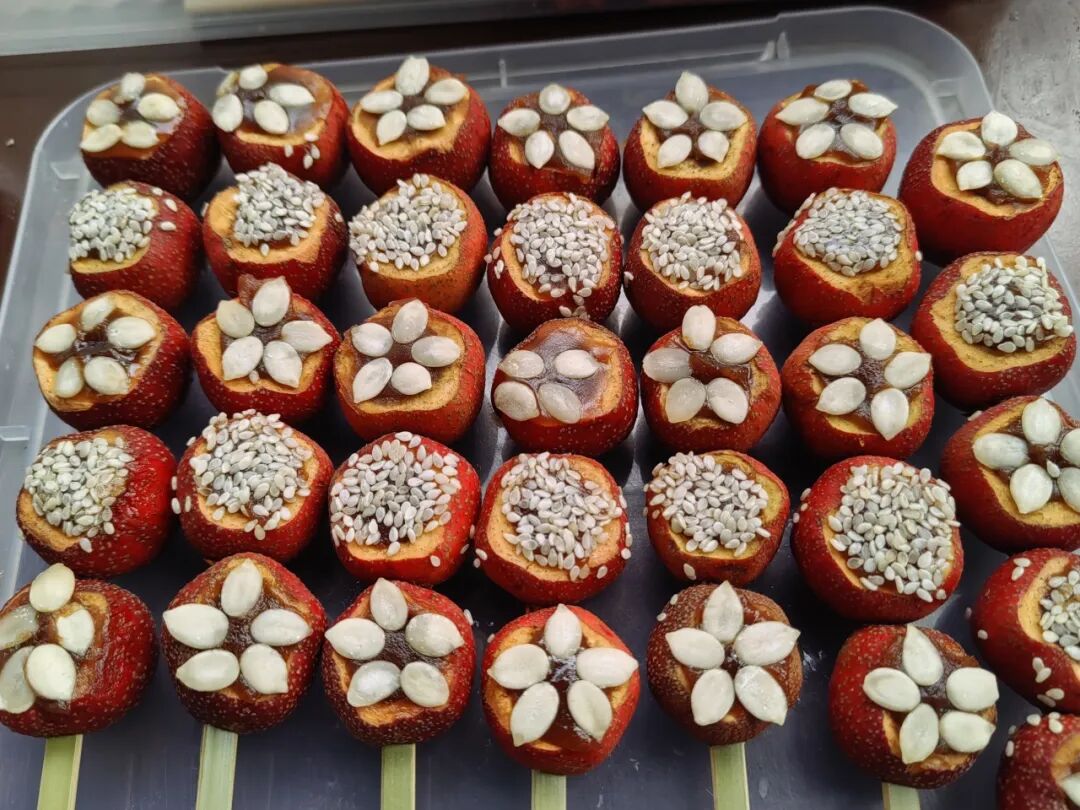 若偏愛酸甜驚喜,酸蘸兒定能戳中你——紅彤彤的山楂裹上琥珀色焦糖殼,“咔嚓”咬破時(shí),酸甜果香混著焦香在口腔炸開,堪稱油膩克星!
