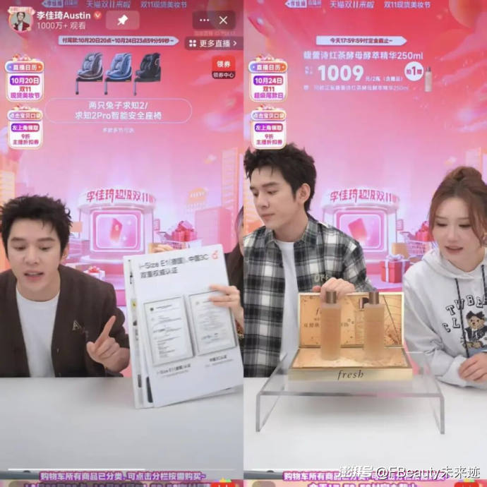 其中在達人帶貨中,粉絲量100萬以下的中小達人貢獻了超80%的銷售額,成為美妝帶貨的中堅力量;頭部直播間如@與輝同行 同樣表現(xiàn)得極為亮眼——根據(jù)第三方數(shù)據(jù),10月9日至11日,@與輝同行 雙十一專場吸引近7000萬人次觀看,銷售額超3億元;10月12日董宇輝缺席的情況下,其美妝專場帶貨額仍達7500萬元至1億元,印證了平臺內(nèi)容帶貨的強轉(zhuǎn)化能力。