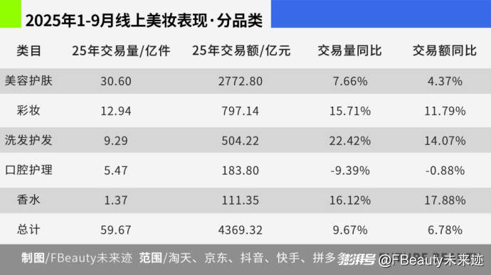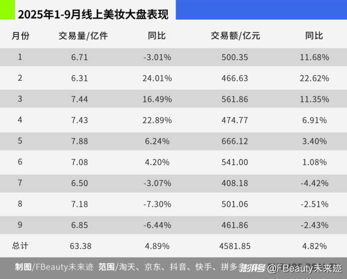 《FBeauty未來跡》獲取到的線上數(shù)據(jù)顯示,今年1-9月全網(wǎng)(淘天、京東、抖音、快手、拼多多)美妝交易總額達到4582億元,同比增長4.8%;總交易量為63.4億,同比增長4.9%。