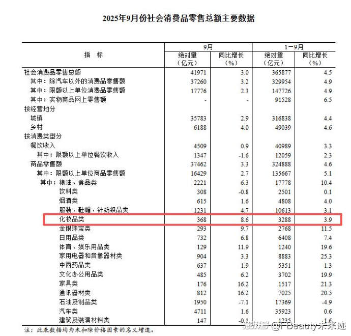 然而,天貓雙11開售的當天,國家統(tǒng)計局公布的數(shù)據(jù)顯示:9月份,社會消費品零售總額同比增長3.0%,其中限額以上化妝品類零售額同比增幅達到8.6%,不僅顯著高于社零總額增速,也是今年以來單月最高增幅。