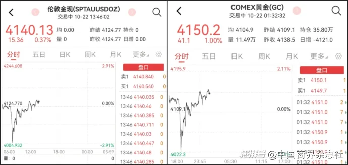 10月22日盤中,COMEX期金、現(xiàn)貨黃金再現(xiàn)深V反轉?,F(xiàn)貨黃金早盤一度險守4000美元大關,跌幅超2%。隨后反彈,午后站上4140美元/盎司,日內漲0.37%。COMEX期金持續(xù)反彈漲幅超1%,現(xiàn)報4150.2美元/盎司。