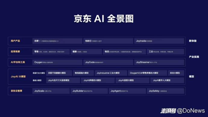 在之前的JD Discovery-2025京東全球科技探索者大會上,京東正式發(fā)布AI全景圖,系統(tǒng)展示其在人工智能領(lǐng)域的整體戰(zhàn)略布局,并宣布未來三年將持續(xù)加大投入,推動構(gòu)建萬億規(guī)模的人工智能生態(tài)。