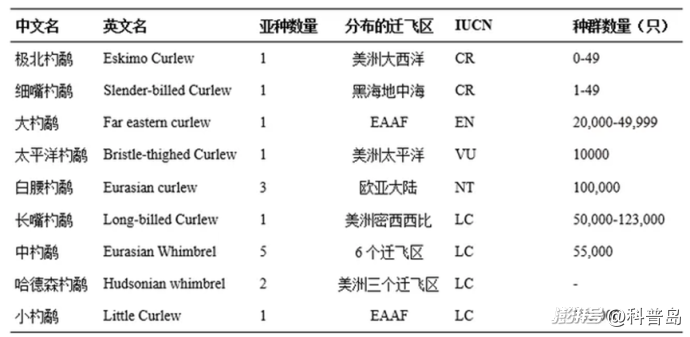 9種杓鷸的IUCN紅色名錄受脅等級(jí), 及種群估值(2021年以前): (IUCN等級(jí):EN-瀕危、VU-易危、NT-近危、LC-無(wú)危)