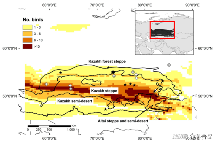 同位素追蹤揭示的細(xì)嘴杓鷸潛在繁殖地,生態(tài)區(qū)域從北到南依次為哈薩克森林-干草原(Kazakh forest steppe),哈薩克干草原(Kazakh steppe),哈薩克半荒漠(Kazakh semi-desert),阿爾泰干草原-半荒漠(Altai steppe and semi-desert),星號(hào)代表5-7月間的目擊記錄,白色十字代表同時(shí)期的標(biāo)本記錄,黑色點(diǎn)即瓦連京發(fā)現(xiàn)的繁殖地,引自Buchanan et al. 2018