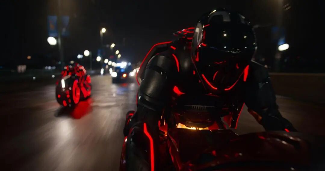 如果說(shuō)《創(chuàng)》系列前兩部電影的光輪摩托是在電子世界中定義規(guī)則,那么《創(chuàng):戰(zhàn)神》則徹底打破了次元壁,將這場(chǎng)霓虹競(jìng)速帶到了我們熟悉的現(xiàn)實(shí)世界。