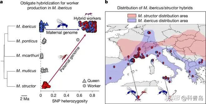 了解了這些,你的螞蟻知識便算入門了,讓我們回歸正題:起初,科學家們猜測,這些雜交蟻的來源或許只是伊比利亞收獲蟻蟻后與工匠收獲蟻雄蟻之間的一段“跨物種之戀”。就像馬和驢雖有生殖隔離,但雜交出的騾子力氣大耐力又強,只是沒有生育能力,很適合用于勞作。