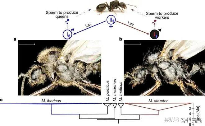 然而,最近一項發(fā)表在《自然》雜志上的研究,卻似乎打破了這一鐵律,也驚掉了科學家的下巴——一種生活在歐洲南部的螞蟻,伊比利亞收獲蟻Messor ibericus,不僅能生出雜交的“天選打工蟻”,竟然還能夠“獨自”克隆出另一個物種——工匠收獲蟻M. structor的雄性個體!這劇情簡直比《雷雨》還離譜。讓人不禁感嘆:大自然,你還有多少驚喜是我們不知道的?