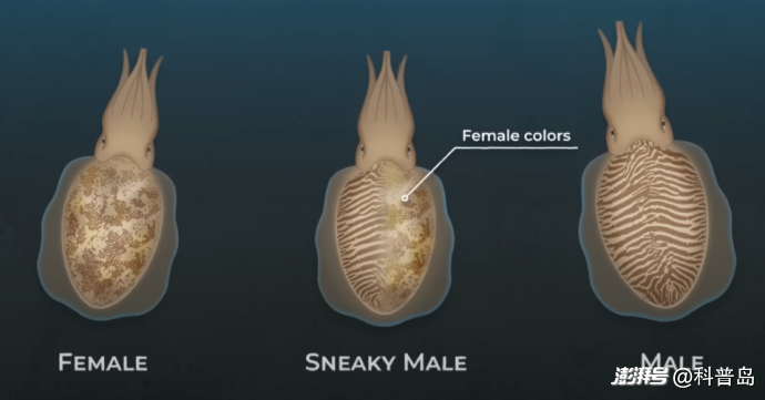然而,這場(chǎng)party對(duì)雄性墨魚(yú)來(lái)說(shuō)可謂是“僧多粥少”,雌雄比例只有1:10,因此這對(duì)于雄性墨魚(yú)來(lái)說(shuō),是一場(chǎng)激烈的繡球爭(zhēng)奪戰(zhàn)。然而體型更大,年齡更大的墨魚(yú)往往占據(jù)了優(yōu)勢(shì),那些當(dāng)年出生的小墨魚(yú)便很難獲得交配機(jī)會(huì),但他們并不甘心,于是便鋌而走險(xiǎn),使出了非常巧妙一招------它們體型較小,與雌性墨魚(yú)較為相似,于是便變換顏色,收起觸手,假裝自己是一個(gè)“女生”,迷惑那些大塊頭,從而正大光明的靠近雌性墨魚(yú)。