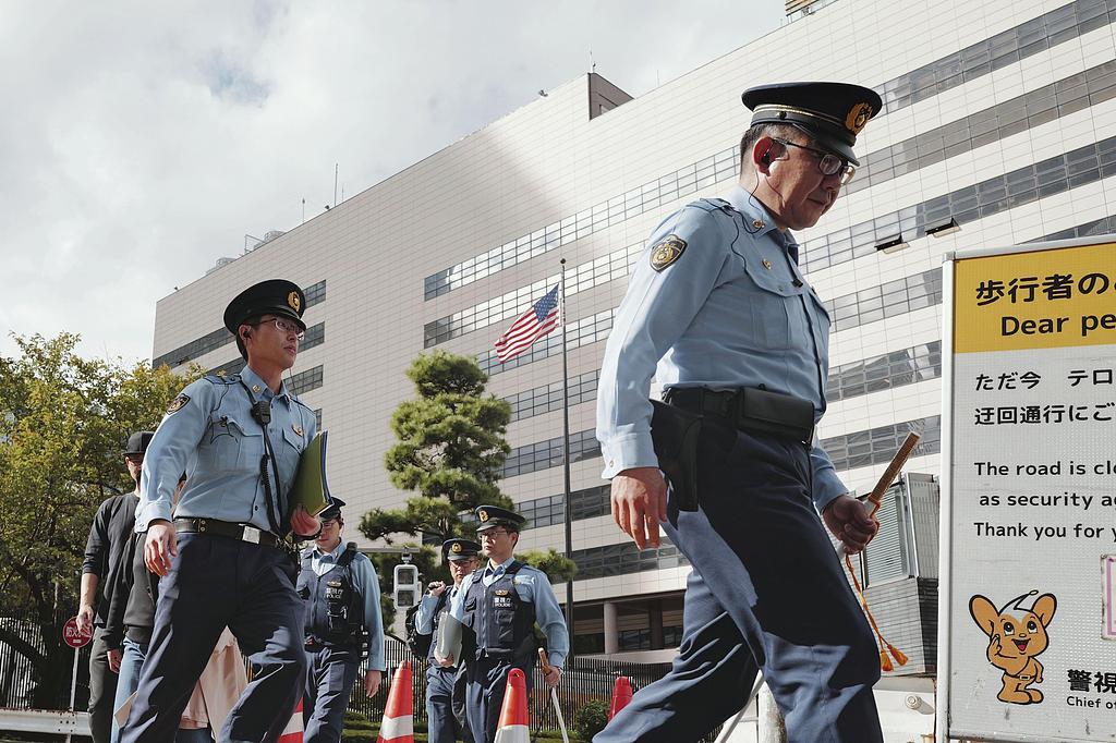 當(dāng)?shù)貢r間2025年10月27日,日本東京,在美國總統(tǒng)特朗普當(dāng)天晚些時候訪問日本前,警察在美國大使館附近巡邏。