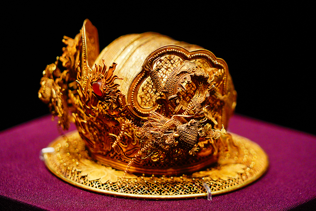 2025年10月23日,北京,在首都博物館“黃金縷——香港故宮文化博物館藏古代金器展”上展出的明朝(1368年-1644年)雙龍戲珠紋梁冠。