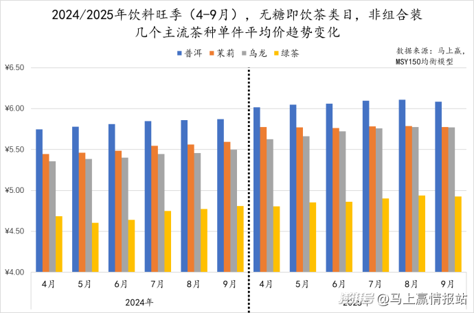 上文中,已經提及了部分無糖茶內烏龍茶種的占比、以及價格上的變化。整體來看,烏龍的占比在無糖茶類目中整體保持穩(wěn)定,價格上則在2025年旺季相比2024年,有一定的件均價同比上升跡象。