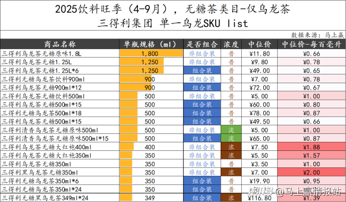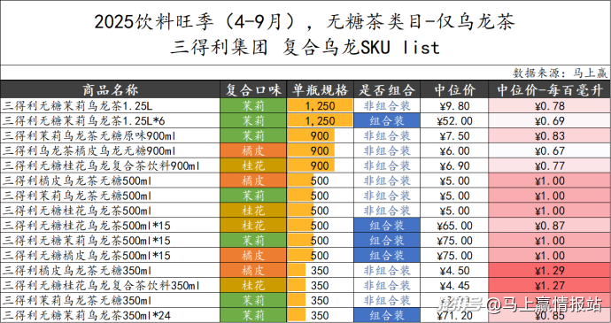 首先來看三得利品牌單一烏龍的SKU產品清單。基于馬上贏品牌CT,三得利共計18個單一烏龍SKU中,覆蓋了從淡到濃的各種風味、從349ML便攜裝到1800ML家庭裝的各種規(guī)格、從6到24瓶的不同組合數量,形成了完整的單一烏龍產品矩陣。通過將代表著品牌最強心智的大單品矩陣化,可以盡可能滿足不同消費場景,不同消費習慣,不同消費量的消費者的消費需求。