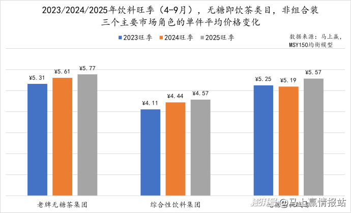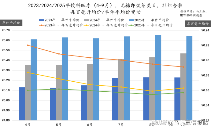 從2023年-2025年飲料旺季(4-9月)的三角色集團非組合裝產品的單件平均價格來看,三者均整體上升,但不同集團存在明顯區(qū)別。其中,老牌無糖茶集團的件均價逐年上漲,且在三角色集團的對比中始終保持相對高的水平;而綜合性飲料集團的件均價是三角色中唯一低于5元的,雖然同樣逐年上升但整體明顯偏低。