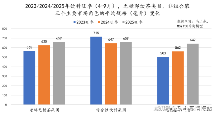 在規(guī)格上,三個角色在2023-2025年旺季表現出了不同的趨勢,但在2025年旺季時已經趨于靠攏。其中,老牌無糖茶集團、無糖茶挑戰(zhàn)者集團的平均規(guī)格有著較為明顯的上升,體現出大規(guī)格化的趨勢。品牌們正在通過進一步的規(guī)格細分,適應不同消費場景的需求。相比來說,綜合性飲料集團的平均規(guī)格雖然在三者之間處于高位,但并未顯著呈現上升趨勢,2025年旺季同比2024年僅有輕微增長。