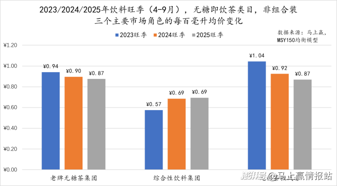 百毫升均價則呈現出了不同的表現情況:其中老牌無糖茶集團的百毫升均價整體平穩(wěn)略有下跌,但依然顯著高于綜合性飲料集團,在2025年旺季與無糖茶挑戰(zhàn)者已經基本持平;綜合性飲料集團在2024年旺季同比2023年有顯著的上漲,2025年旺季與2024年同比基本保持一致;變化較大的依然是無糖茶挑戰(zhàn)者下的幾個集團,其百毫升均價自2023年旺季至2025年旺季均呈現明顯的下探,從2025年旺季與2023年旺季相比,百毫升均價下降了近20%。