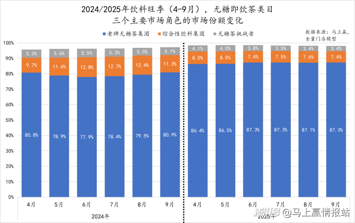 首先是2024/2025年旺季,三個角色的市場表現情況,可以看到相比2024年旺季,2025年旺季期間,老牌無糖茶集團依然占據市場主力地位,且從2025/2024旺季同比來看,仍有一定的市場份額提升。綜合性飲料集團與無糖茶挑戰(zhàn)者在2025年旺季的市場份額,同比2024年旺季均有縮減。市場份額絕對值縮減較多的是綜合性飲料集團,其市場份額加總目前不足10%,且在旺季中有進一步縮減的趨勢。相比來說,無糖茶挑戰(zhàn)者在2024年旺季時還能穩(wěn)定在5%左右的市場份額,但到2025年旺季尾部的8、9月時,其加總的市場份額僅剩3.4%,市場空間被進一步壓縮。