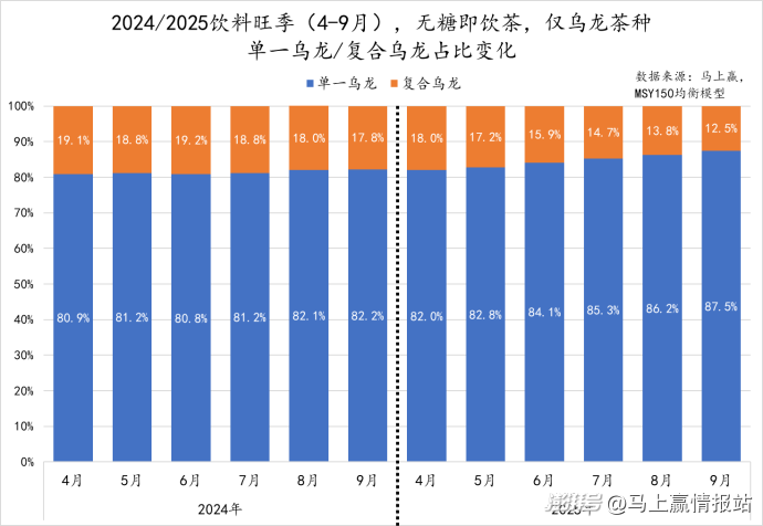 值得注意的是無糖茶挑戰(zhàn)者在這一類型產品中的市場份額變化。在2024年旺季,無糖茶挑戰(zhàn)者在復合烏龍中的市場份額接近50%,2025年則超過50%、接近60%,且在兩個旺季周期內,都呈現出市場份額增長的態(tài)勢。