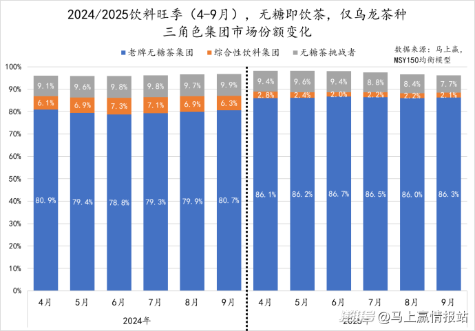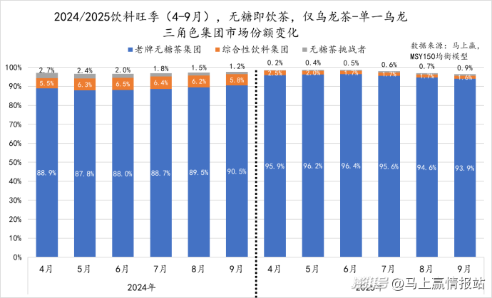 從單一烏龍茶種市場的三角色分位格局來看,老牌無糖茶集團始終居于主導地位,且在2025年旺季同比2024年旺季,這一格局還有持續(xù)加強的跡象。在2025年旺季,老牌無糖茶集團在單一烏龍這一口味內的峰值市場份額已經超過95%。相比來說,綜合性飲料集團在單一烏龍中的市場份額接近腰斬。無糖茶挑戰(zhàn)者們的市場份額則不足1%,市場份額同樣腰斬。