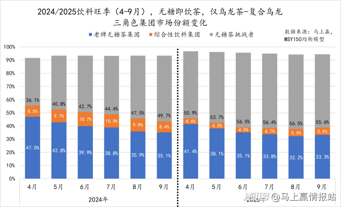 但在無糖即飲茶-烏龍-復合烏龍中,呈現的卻是完全不一樣的市場格局:老牌無糖茶集團的市場份額未過半數,且有一定下滑趨勢。綜合性飲料集團的市場份額亦呈現同比下滑狀態(tài),從2024年旺季平均的10%左右,下滑到2025年旺季平均的5%左右。