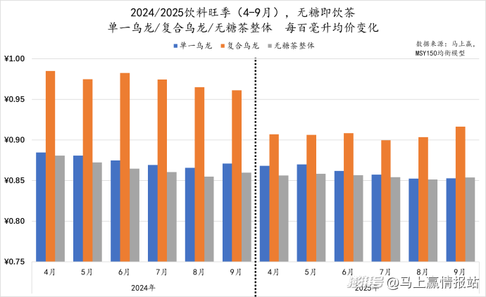 從無糖茶整體和單一/復合烏龍茶種的百毫升均價變化來看,單一烏龍作為烏龍中占比絕大多數的口味,與無糖茶整體的百毫升均價及變化趨勢的正相關程度較高。相比來說,復合烏龍的價格變化則較為顯著,從2024年旺季至2025年旺季有明顯下滑。這或許是因為參與復合烏龍的新銳品牌較多,其市場動作和促銷活動相對也更頻繁。